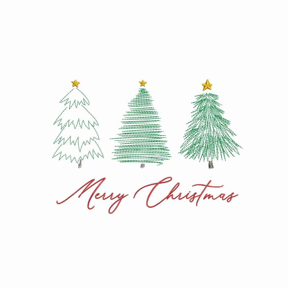Capture the simple beauty of the holiday season with this exquisite “Merry Christmas” machine embroidery design. This pattern features a trio of wonderfully rendered Christmas trees, each with a unique, minimalist sketch style, topped with a delicate star. Below, the phrase “Merry Christmas” is scripted in a graceful font, adding a touch of elegance.